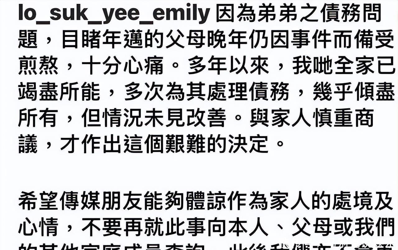 卢淑仪作为姐姐,在岳父声明发布后不久通过相同渠道作出回应。她在回应中指出,弟弟的债务问题导致年迈父母晚年仍需承受巨大压力,全家多年来已多次为其处理债务,投入金额几乎达到家庭所能承受的极限,但相关情况始终没有出现任何好转迹象。她强调,此次决定是经过全家慎重讨论后作出的,语气中流露出对父母处境的痛惜,同时明确表示希望外界停止对家人的打扰。卢淑仪的回应没有回避债务规模,也没有为弟弟的行为作任何辩解,直接承认家庭已“几乎倾尽所有”仍无法改变现状。