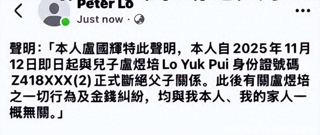 2025年11月12日,李克勤岳父卢国辉在社交平台发布正式声明,宣布即日起与儿子卢煜培断绝父子关系。声明内容明确指出,自该日起,卢煜培的一切行为及金钱纠纷均与卢国辉本人及其家人无关。声明还附上了双方身份证号码,以示决绝态度。此事迅速在香港娱乐圈及网络上引发广泛关注,多家媒体当天即跟进报道,事件核心聚焦于卢煜培长期积累的巨额债务已对整个家庭造成持续造成严重负担。