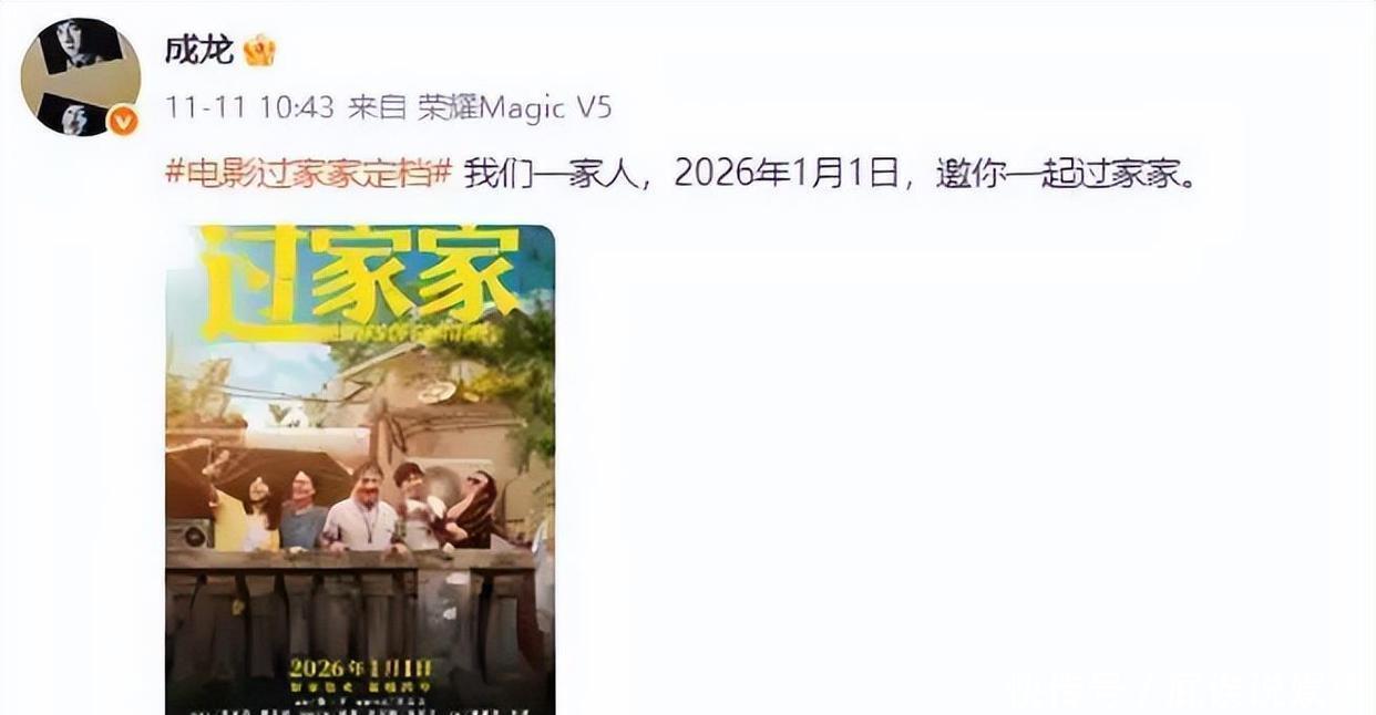 再说一嘴,11月11日成龙大哥又在社交平台发了一条动态,他那部新电影《过家家》就得等到明年1月1日跟大家见面啦!