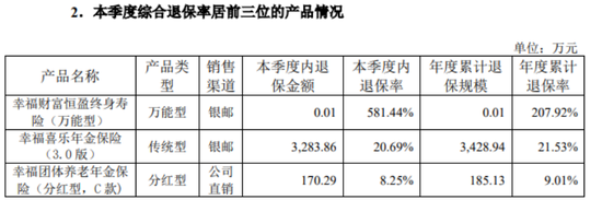 而第三季度综合退保率居前三位的产品,分别为幸福财富恒盈终身寿险(万能型)、幸福喜乐年金保险(3.0版)、幸福团体养老年金保险(分红型,C款),本季度内退保率分别为581.44%、20.69%、8.25%,退保金额分别为0.01万元、3283.86万元、170.29万元。