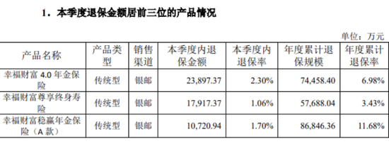 报告披露,幸福人寿第三季度退保金额居前三位的产品,分别为幸福财富4.0年金保险、幸福财富尊享终身寿险、幸福财富稳赢年金保险(A款),年度累计退保金额分别为7.44亿元、5.76亿元、8.68亿元。